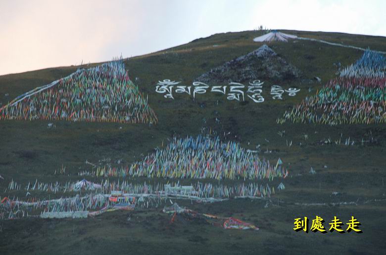 山上有嘛尼經幡組成的三角形或四方形的眾多旗陣,