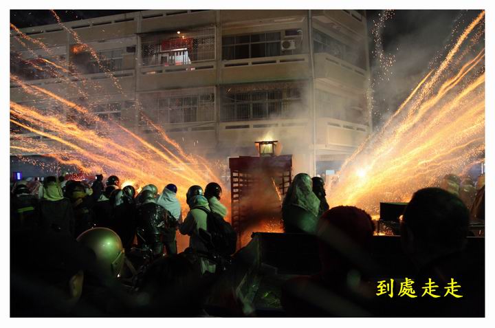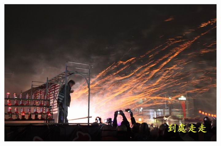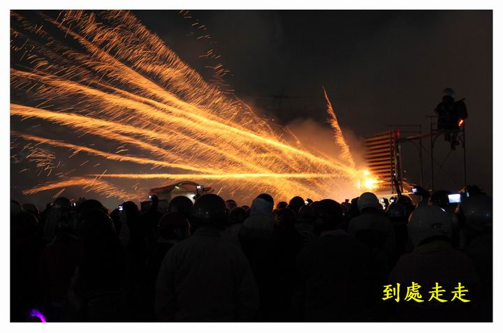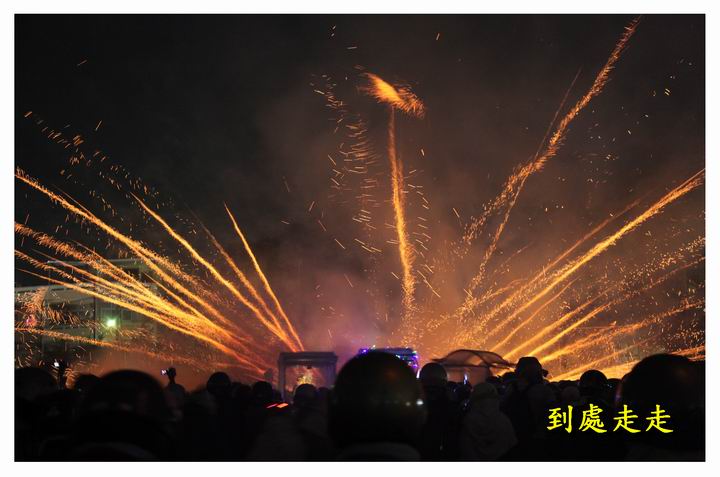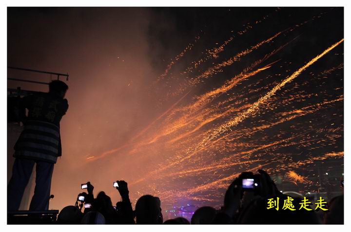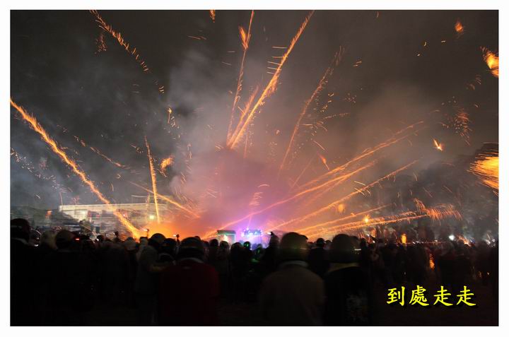 數萬支的炮仔群從炮城上飛奔出去,頓時群蜂亂舞、火光四射