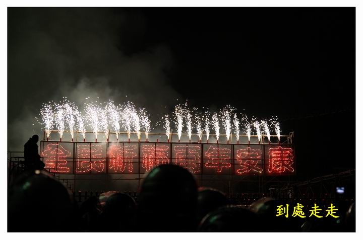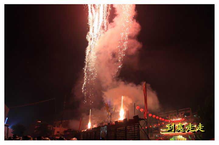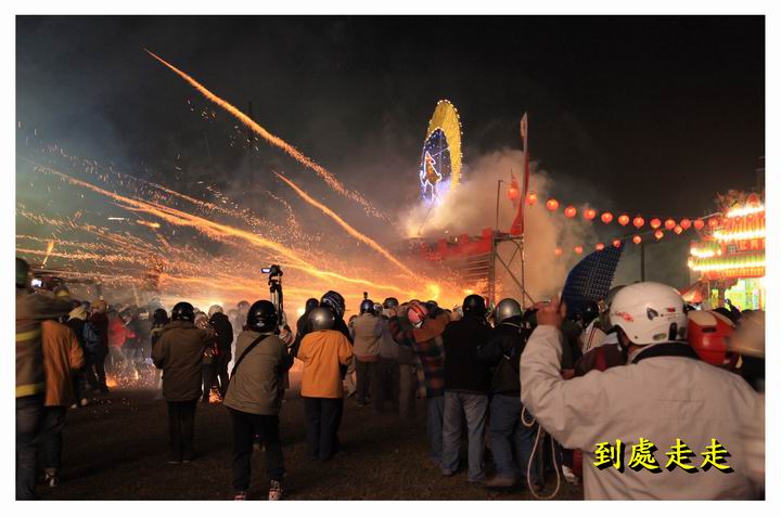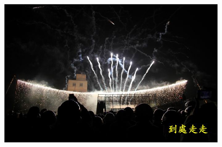 晚上8點多開始操場先施放蜂炮體驗營架設的數座小型炮城,